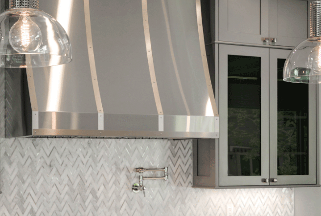 Gray is one of the most fashionable colors to design with at the moment because of its extreme versatility. In this kitchen, everything is gray including the Simply Gray cabinets, the stainless range hood, flooring, back-splash and lighting fixtures. Although there are numerous shades of gray used, together they artfully coalesce to create a warm and transitional environment. The designer also focused on clean lines and geometric patterns which is why almost all of the wall cabinet doors are the same width which evokes harmony and comfort.